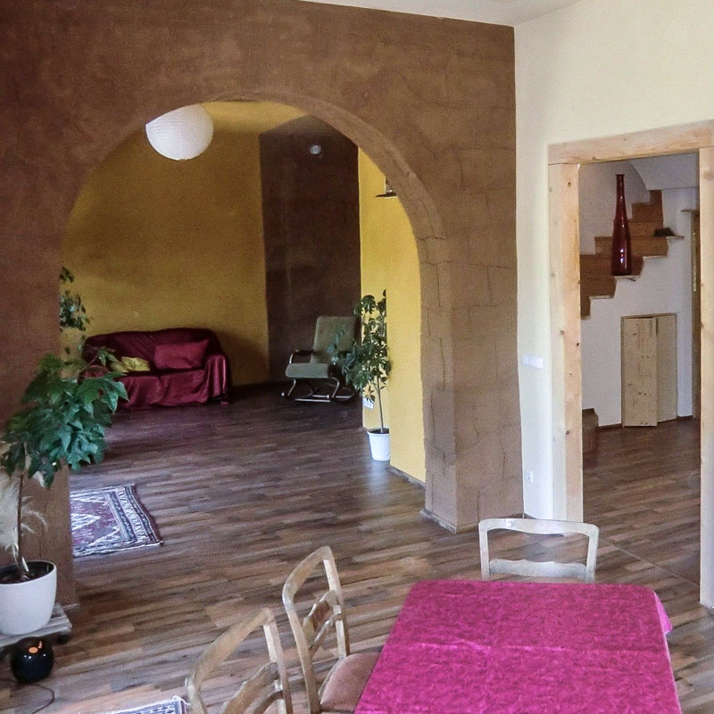 Wohn-Küche mit Gewölbe in Lehmtrockenbau mit Lehmwandheizung