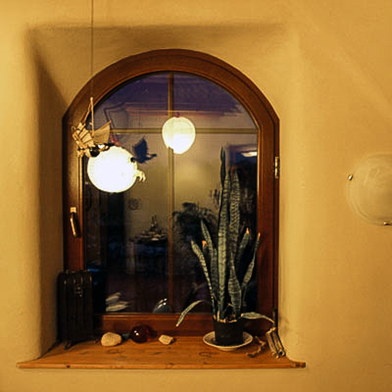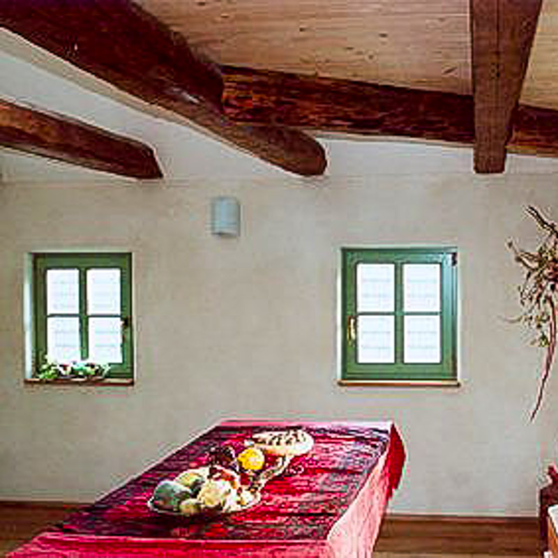 Wohn-Küche mit Gewölbe in Lehmtrockenbau mit Lehmwandheizung
