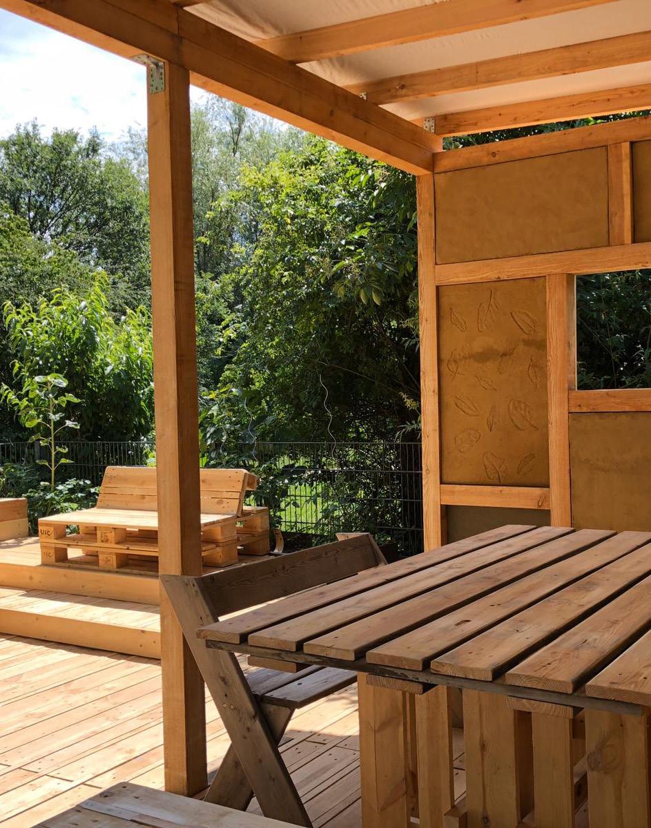 wurden ebenfalls Paletten verwendet, um so den Pavillon und die Sitzmöbel