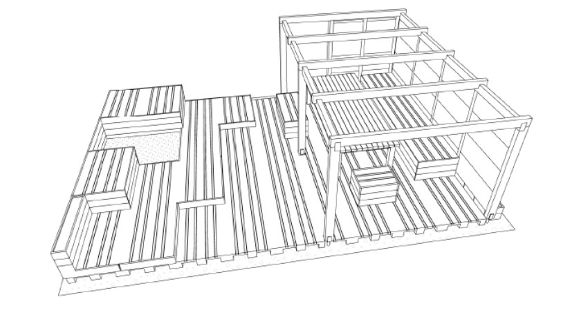 Entwurf des Pavillons wurde den Maßen der Paletten, die für das Bodenkonzept